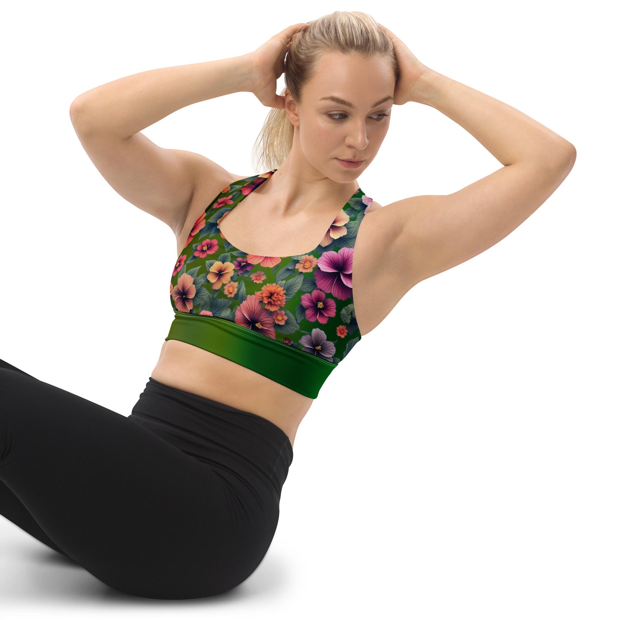 Floral Hibiscus Recycled Longline Sports Bra - Sustainable, Eco-Friendly Activewear on Green Background - Fitness Apparel