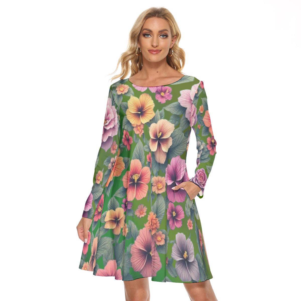 Hibiscus Print Long Sleeve Dress | Above Knee Crew Neck Style on Lush Green Fabric
