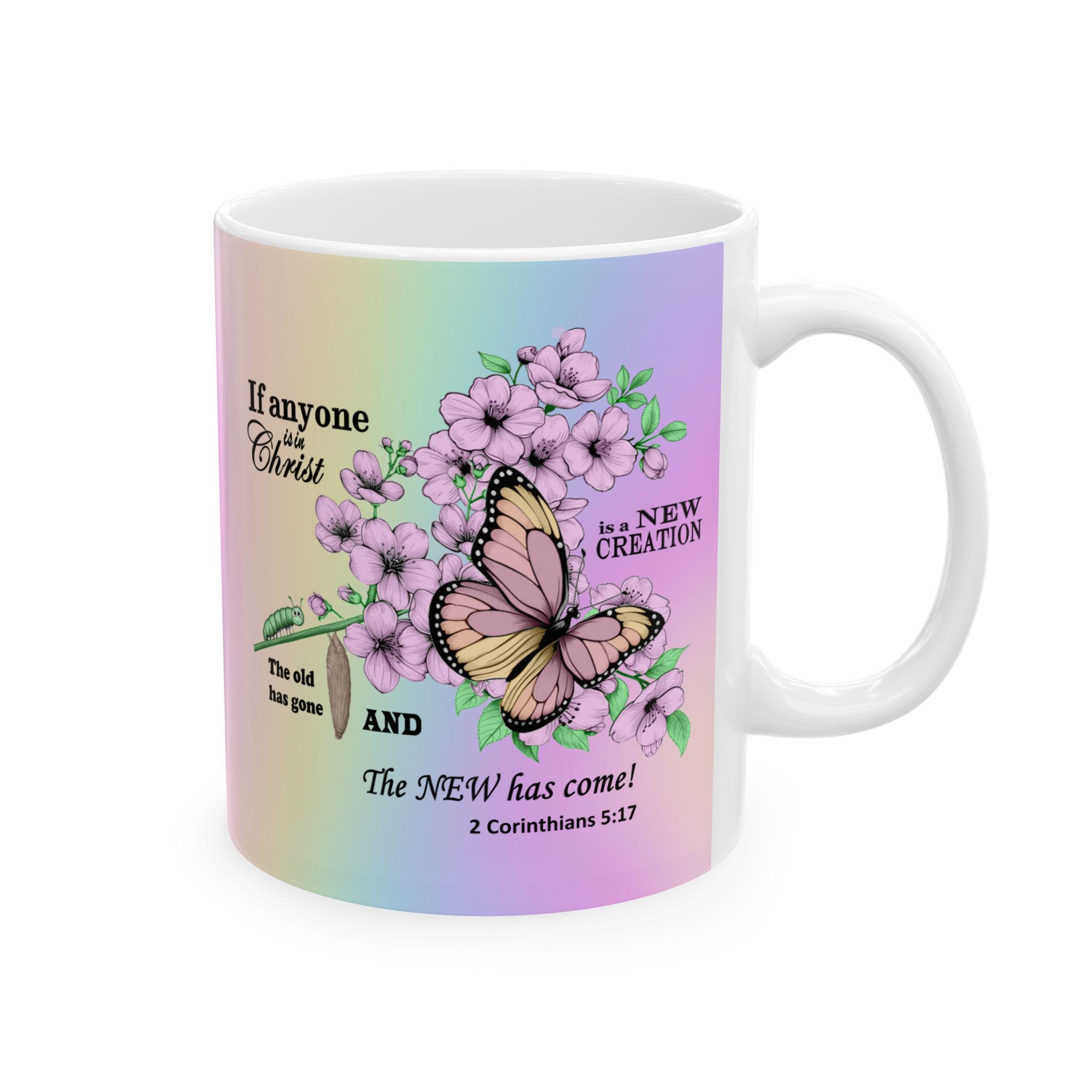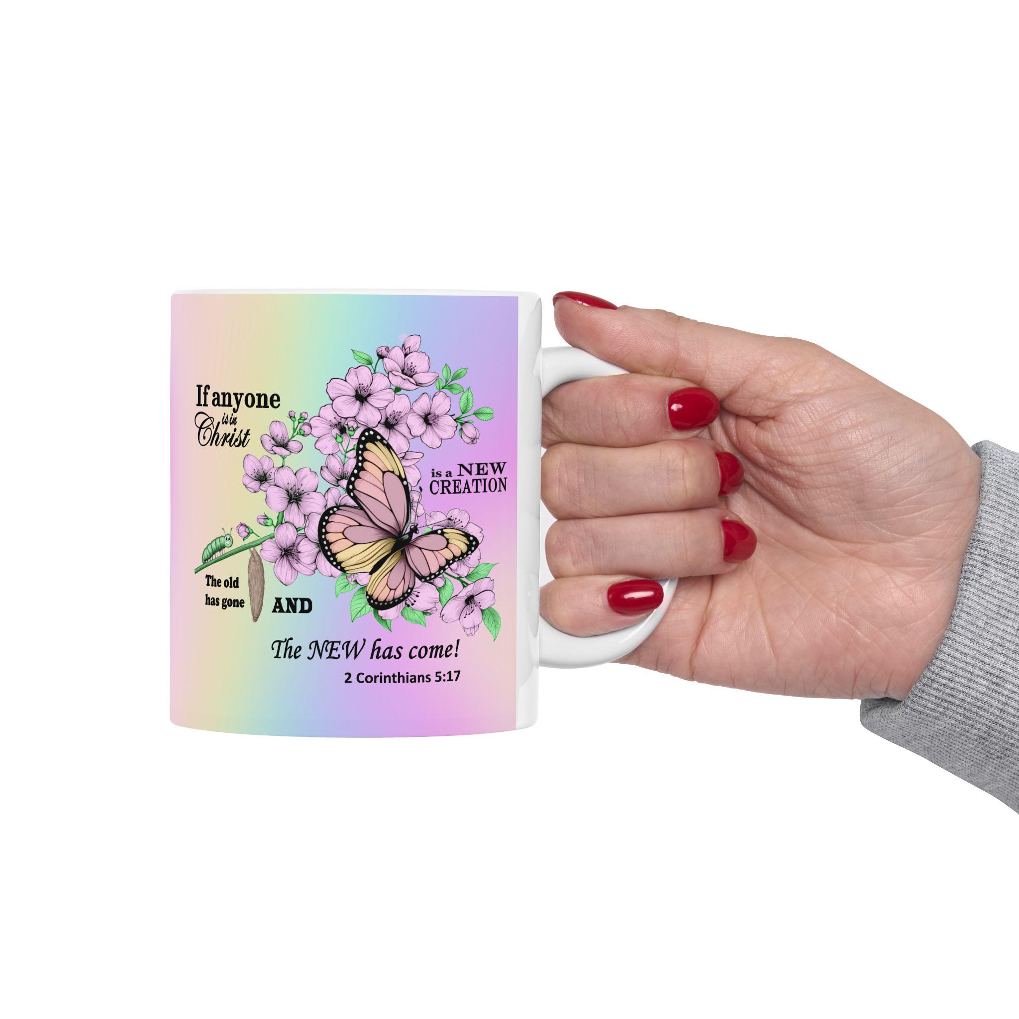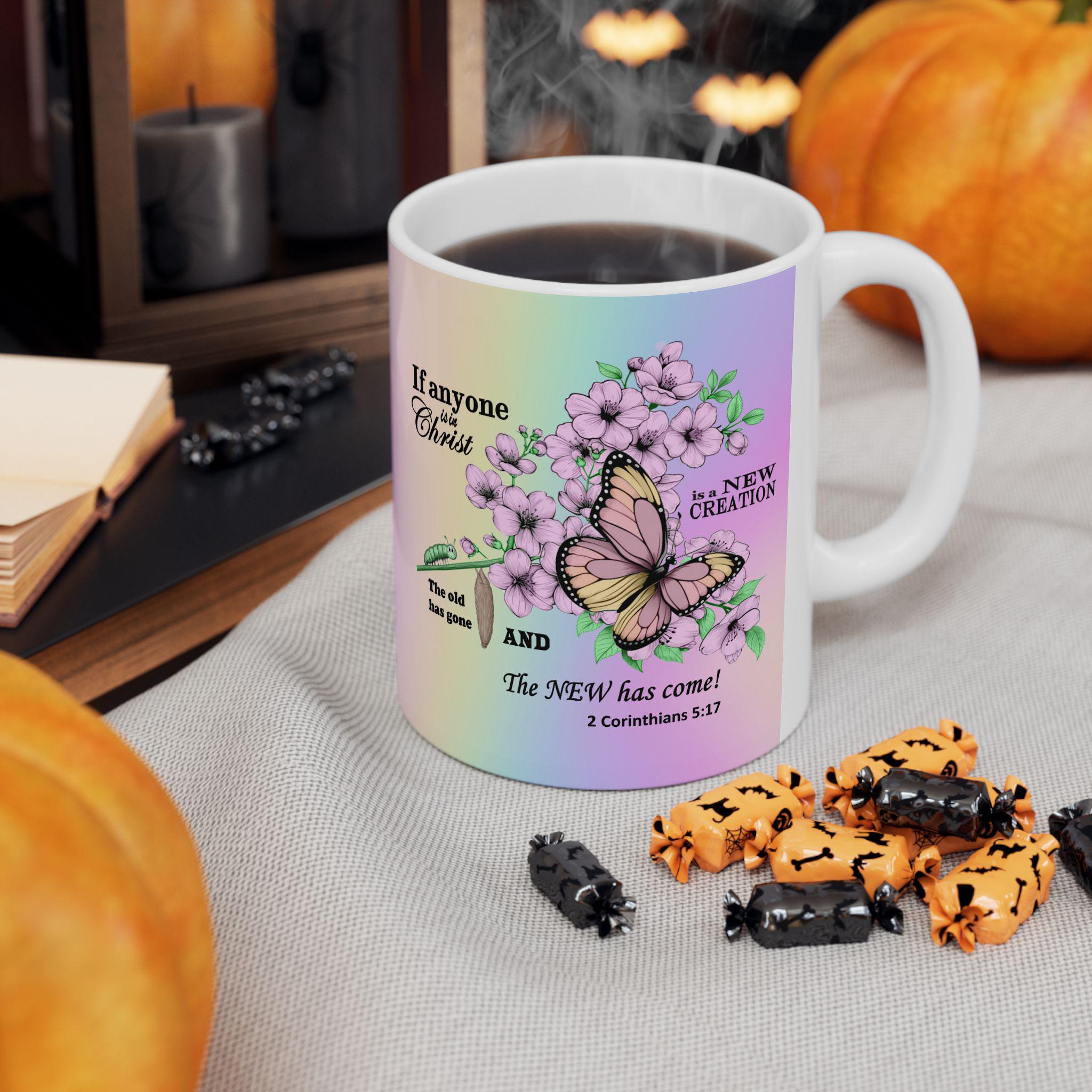 A ceramic mug featuring a caterpillar to butterfly picture with a Bible verse about renewal. Perfect for those seeking inspiration and a reminder of transformation in their daily lives. Ideal for coffee or tea drinkers looking for a meaningful and uplifting mug to start their day. Great gift for religious holidays, birthdays, or special occasions.