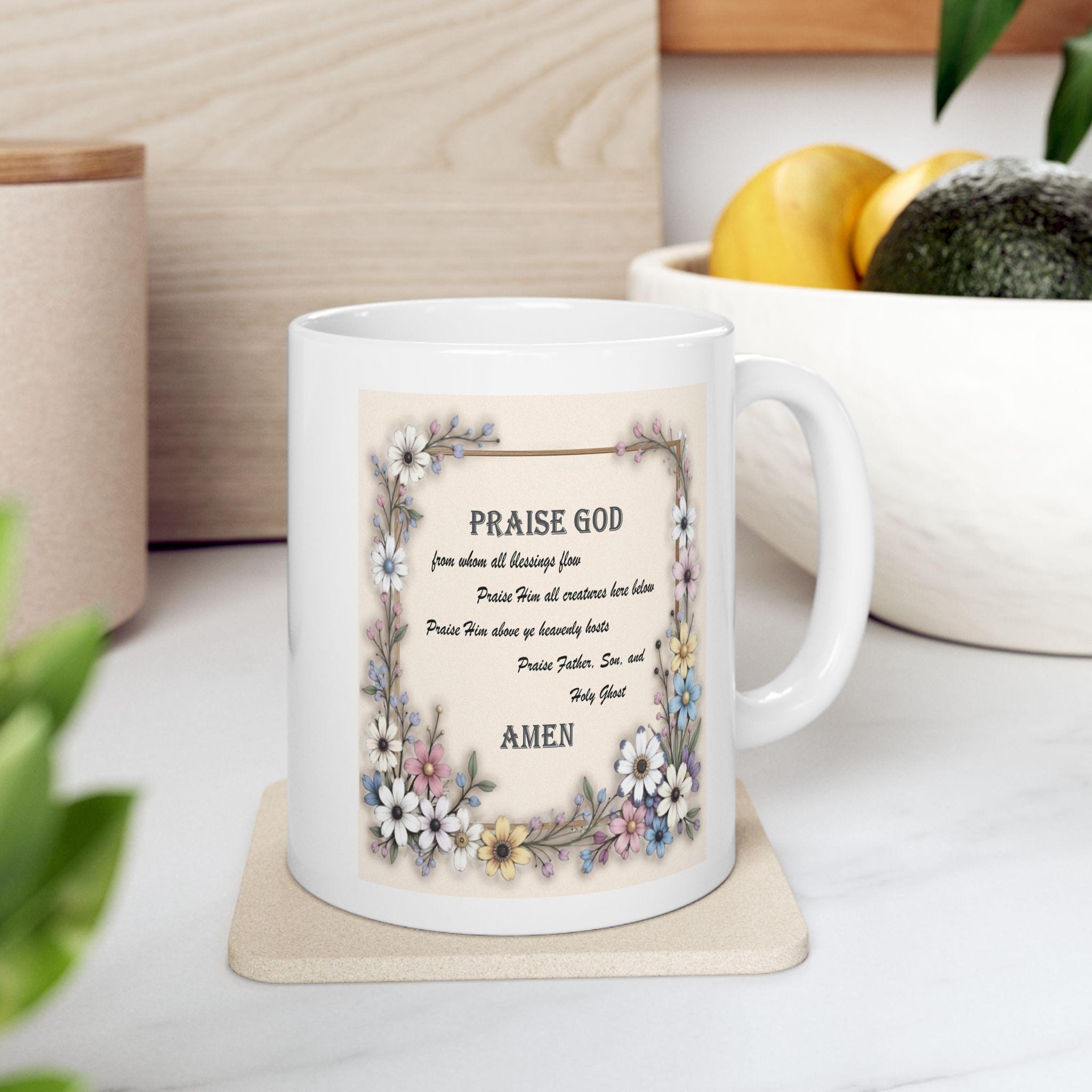 A ceramic mug featuring a doxology with a floral frame design. This mug gives off a cozy and peaceful vibe, making it perfect for enjoying your favorite hot beverages. Ideal for individuals who love floral patterns and uplifting messages. Relevant for everyday use, gift-giving, birthdays, and special occasions.