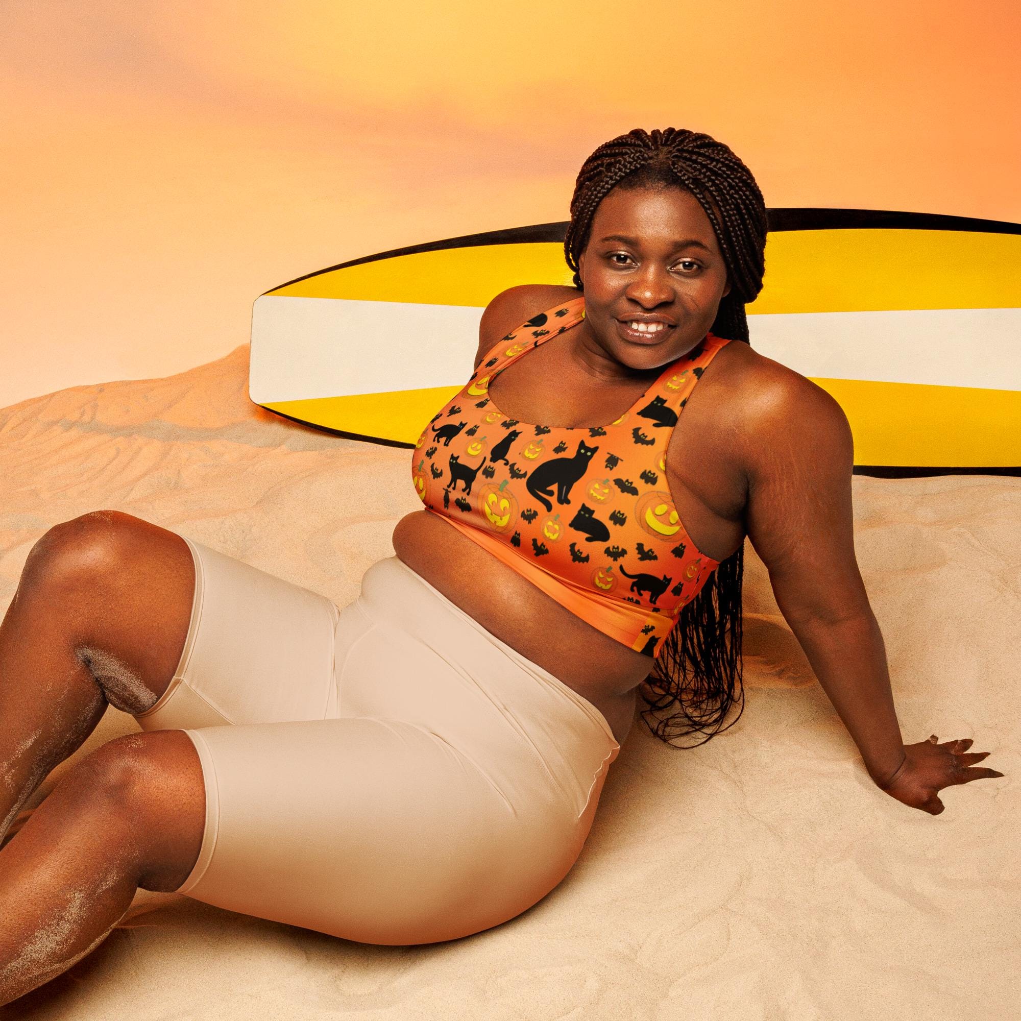 Recycled Halloween Print Longline Sports Bra for Women | Pumpkins, Bats, and Black Kitty Cats | Spooky Activewear