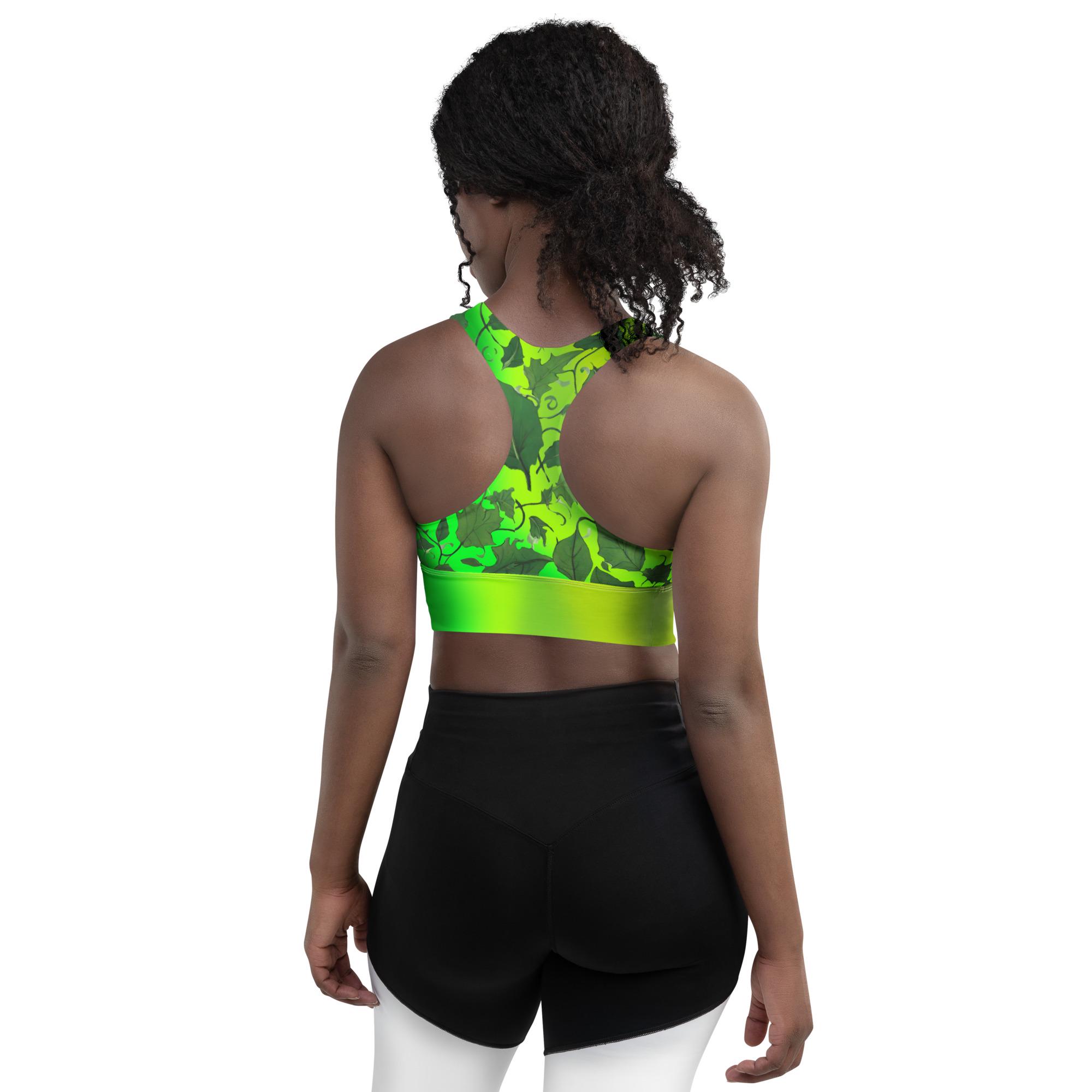 Recycled Fabric Longline Sports Bra: Green Leaves Gradient Design
