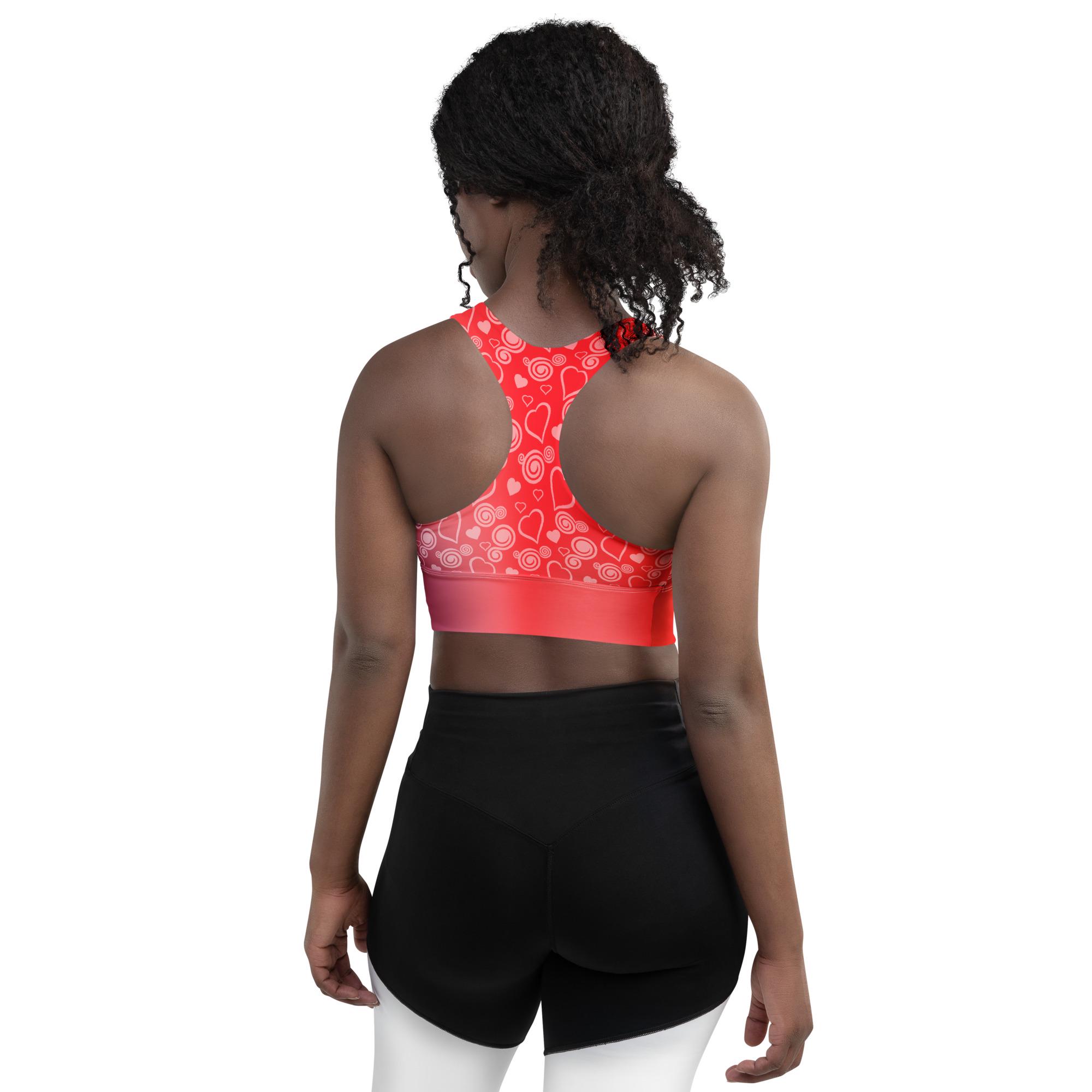 Recycled Longline Sports Bra with Hearts and Swirls on Red Gradient – Eco-Friendly Compression Activewear