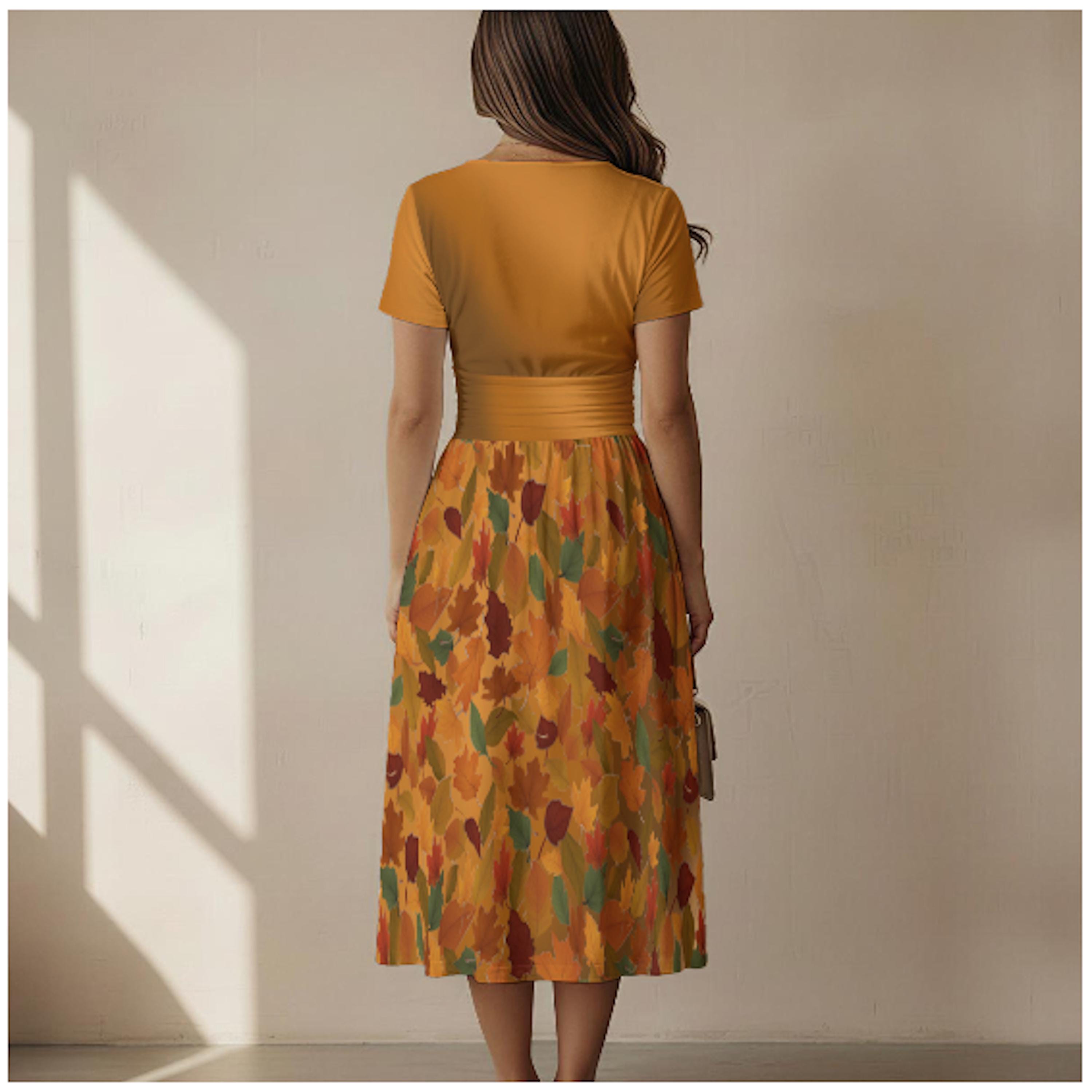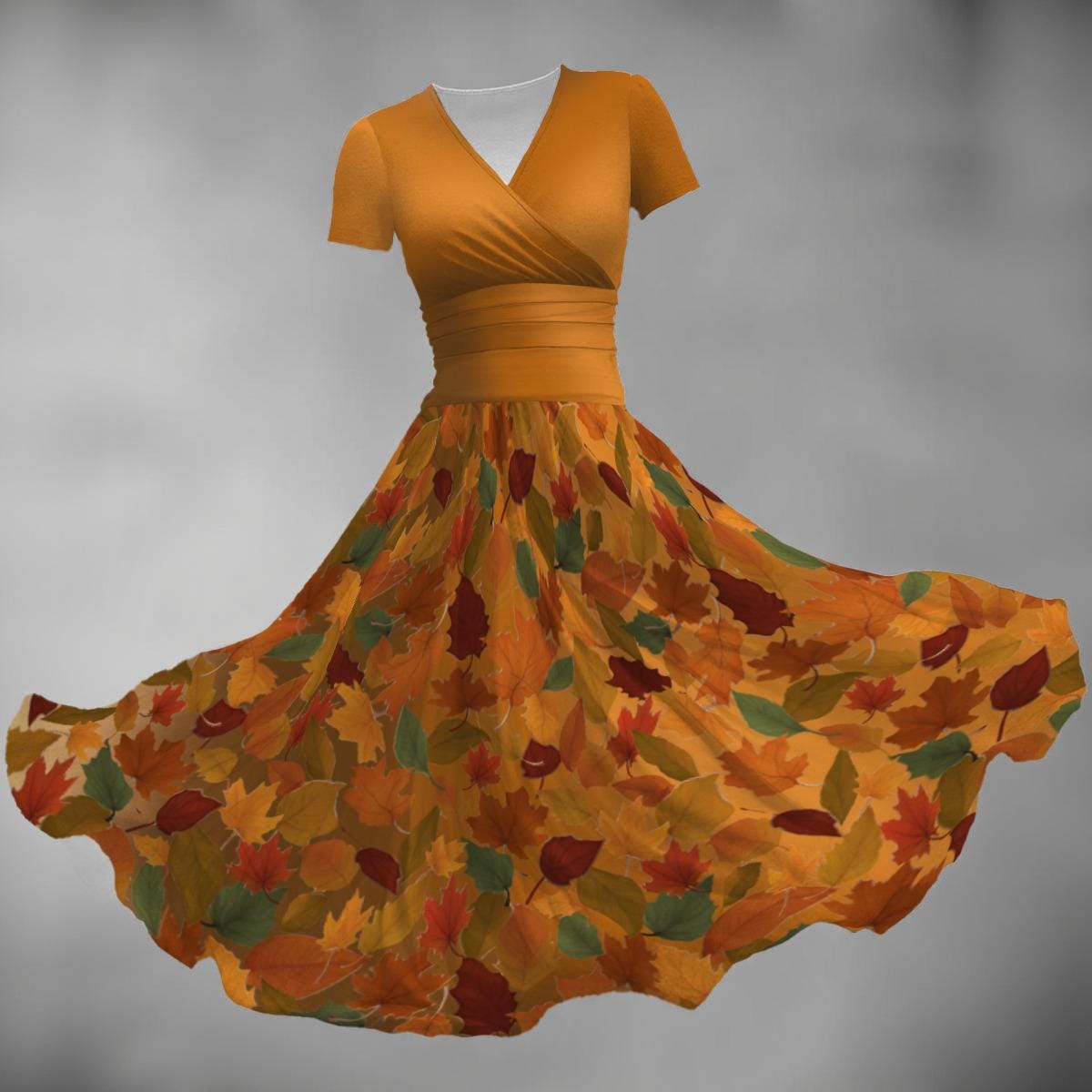 Embrace the warmth of autumn with this Women’s short sleeve dress featuring a rich brown gradient top half and a flowing skirt adorned with a vibrant fall leaves print. The flattering bodice blends gently into a skirt filled with autumn foliage motifs, creating a seasonal look that’s both stylish and cozy. Made with soft, breathable fabric and designed for comfort, this dress is perfect for casual gatherings, pumpkin-patch photos, or everyday fall wear. Pair it with ankle boots or a cozy cardigan to complete the look.
