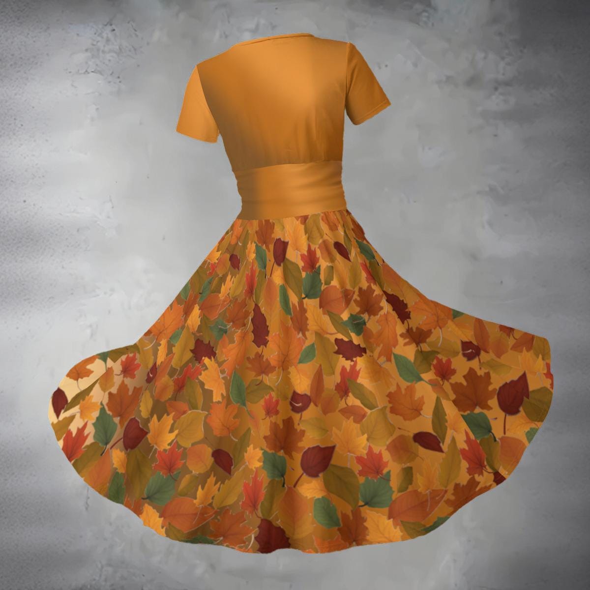 Women’s Short Sleeve Dress with Brown Gradient Bodice & Fall Leaves Print Skirt | Autumn Leaf Pattern Dress
