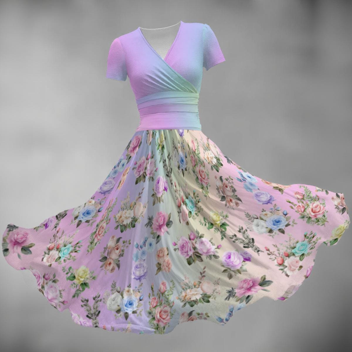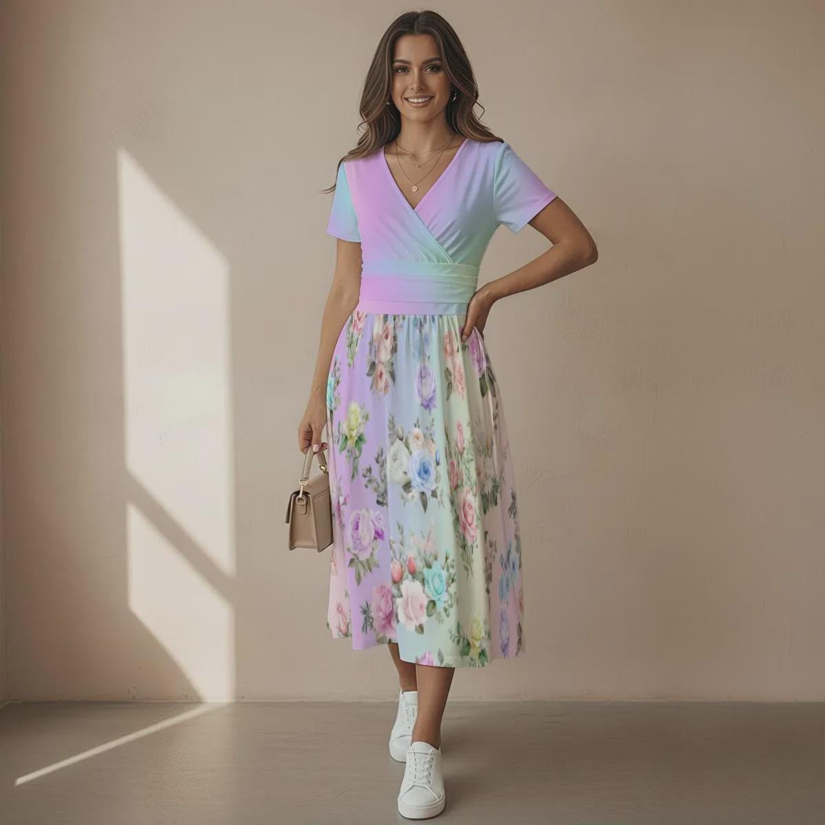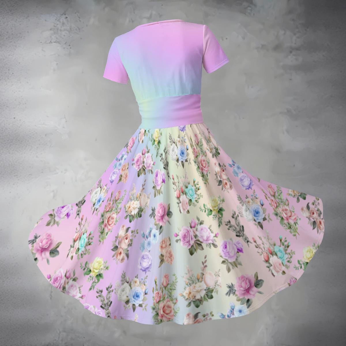 Bring soft, dreamy style to your everyday wardrobe with this Pastel Rainbow Floral Print Women’s V-Neck Short Sleeve Dress. Featuring a cheerful all-over floral design in pastel rainbow hues, this dress blends whimsical charm with effortless comfort. The flattering V-neck and relaxed short sleeves create a silhouette that’s ideal for casual outings, spring strolls, garden parties, or weekend brunches.