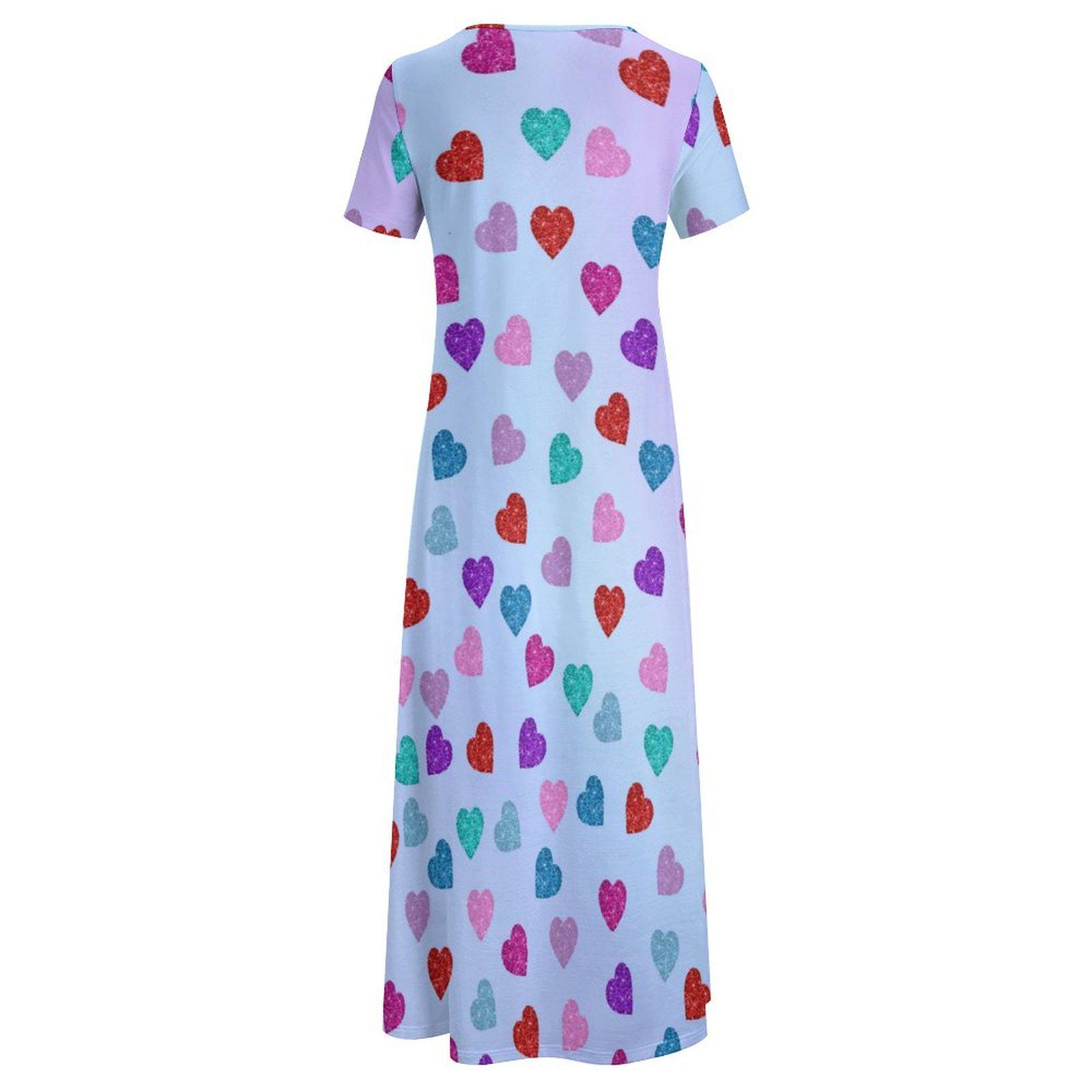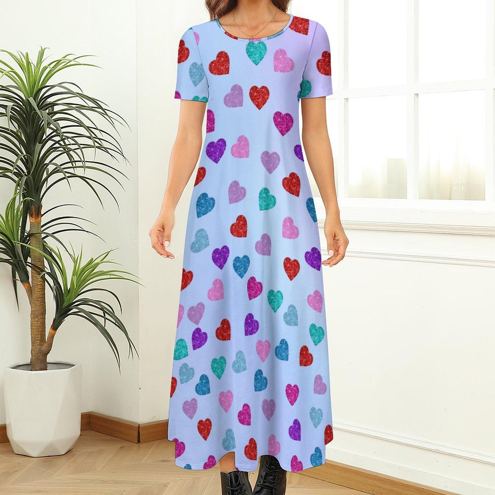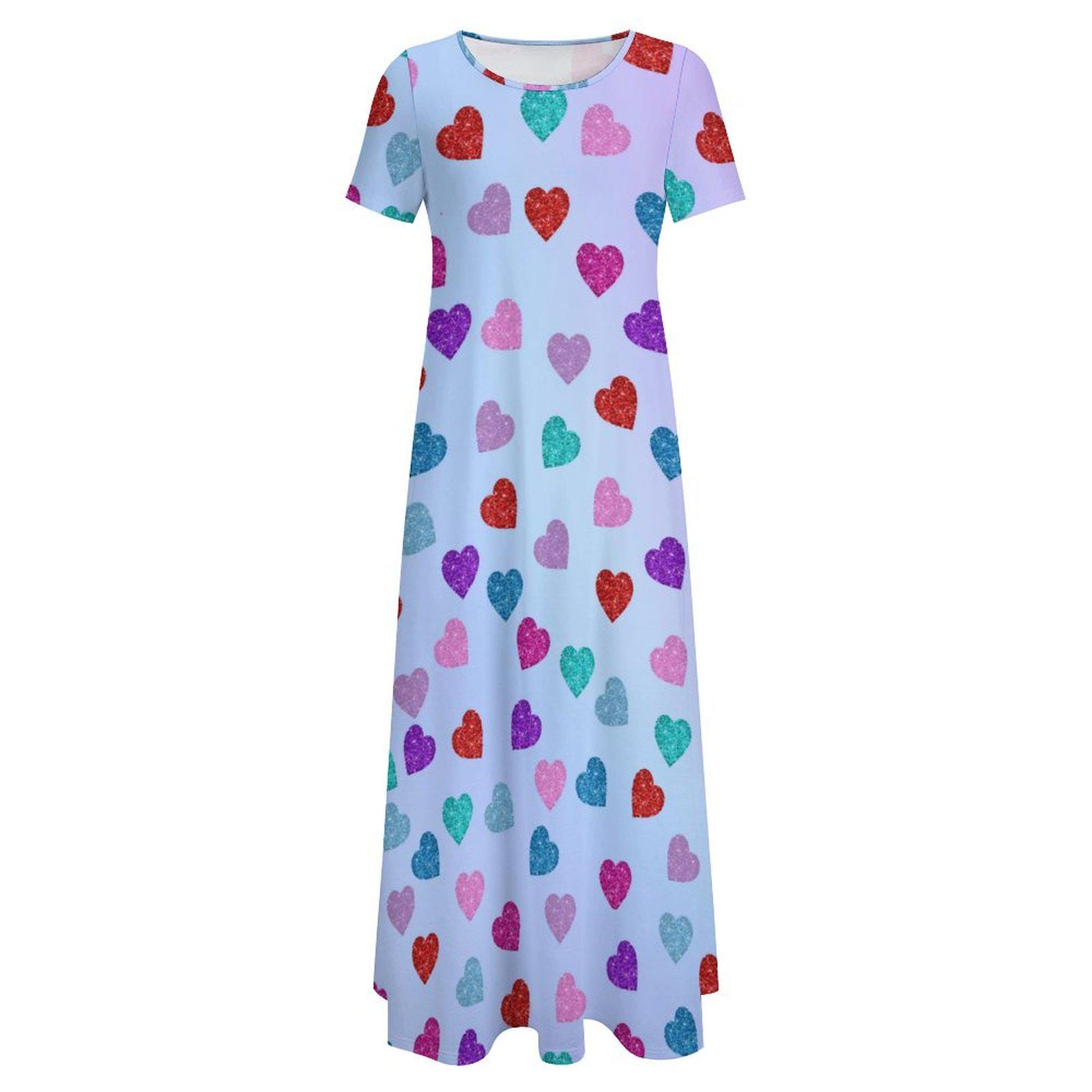 Multicolored Hearts Round Neck Short Sleeve Dress