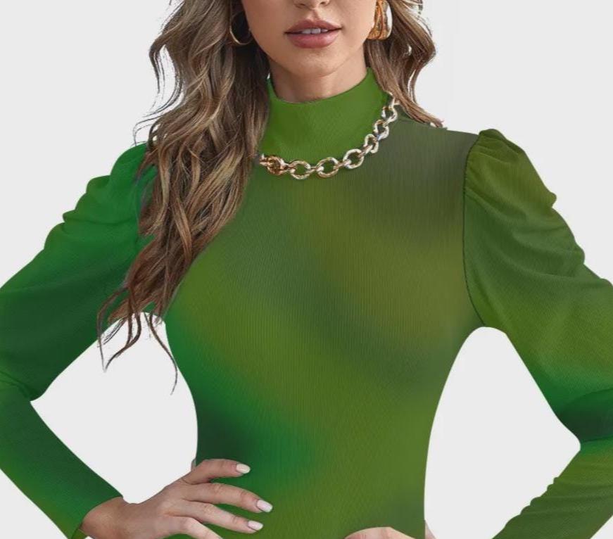 Army Green Women's Turtleneck Bodysuit With Puff Sleeve
