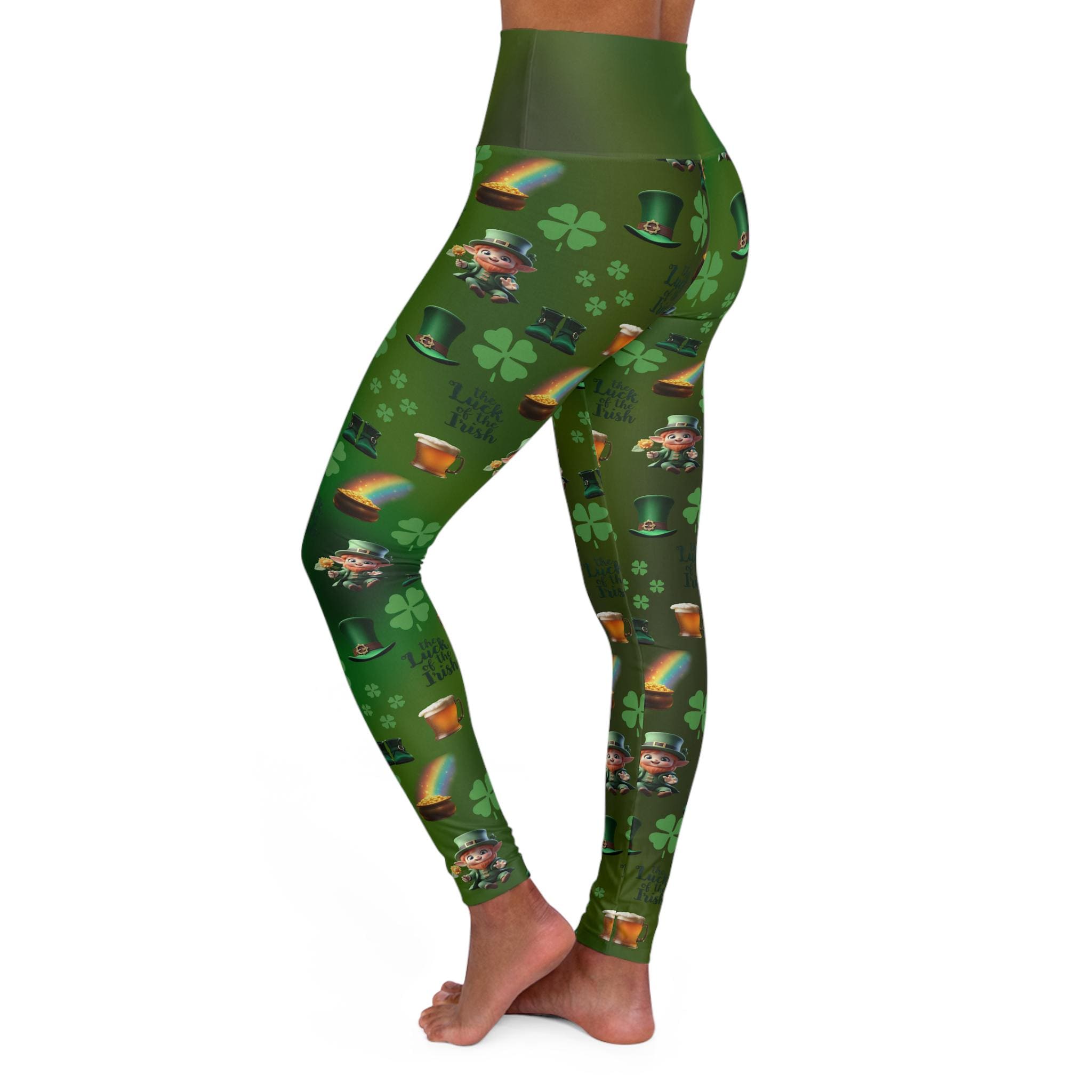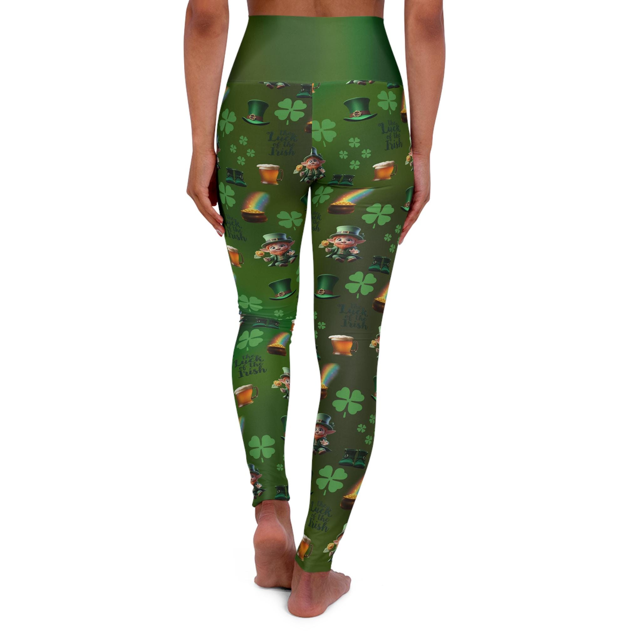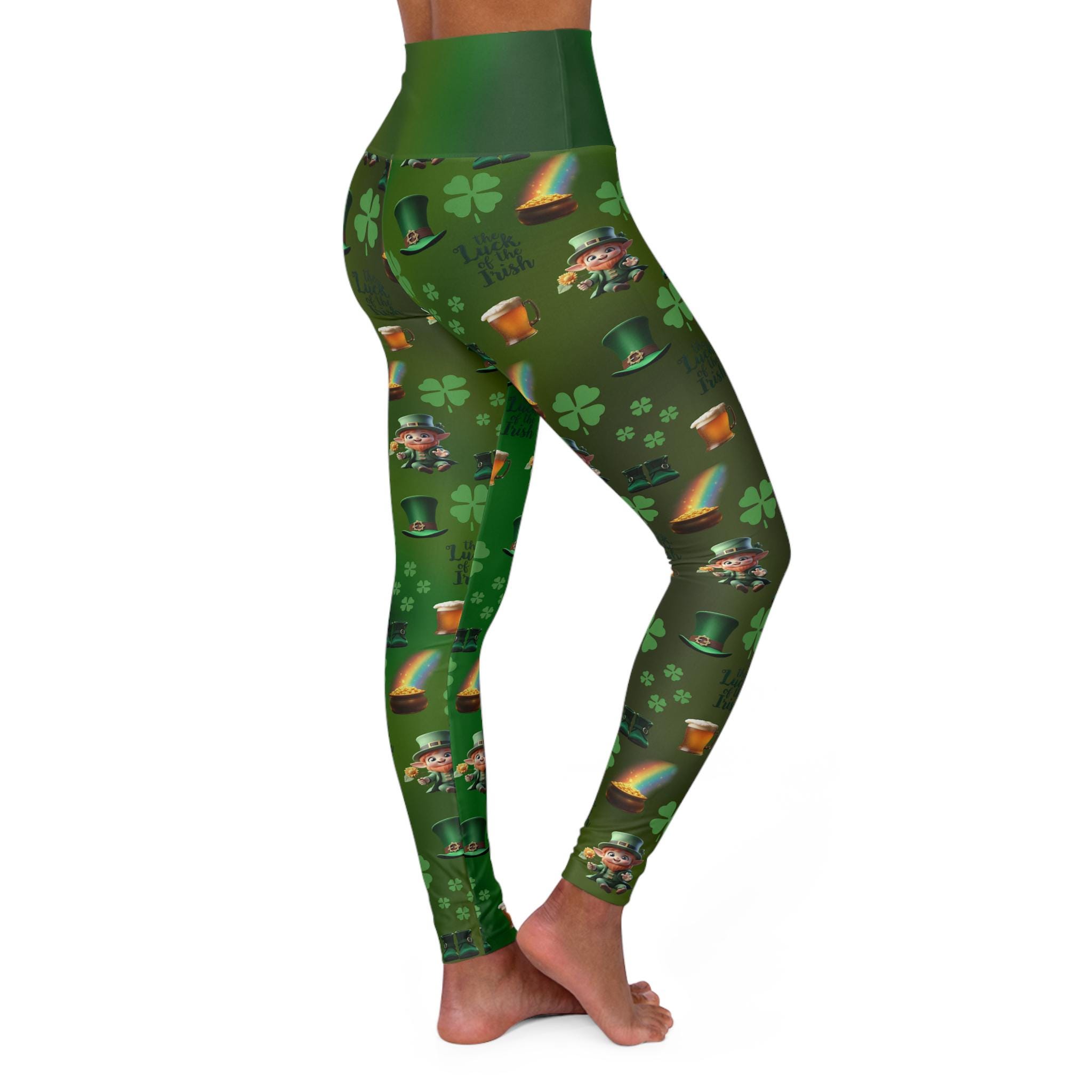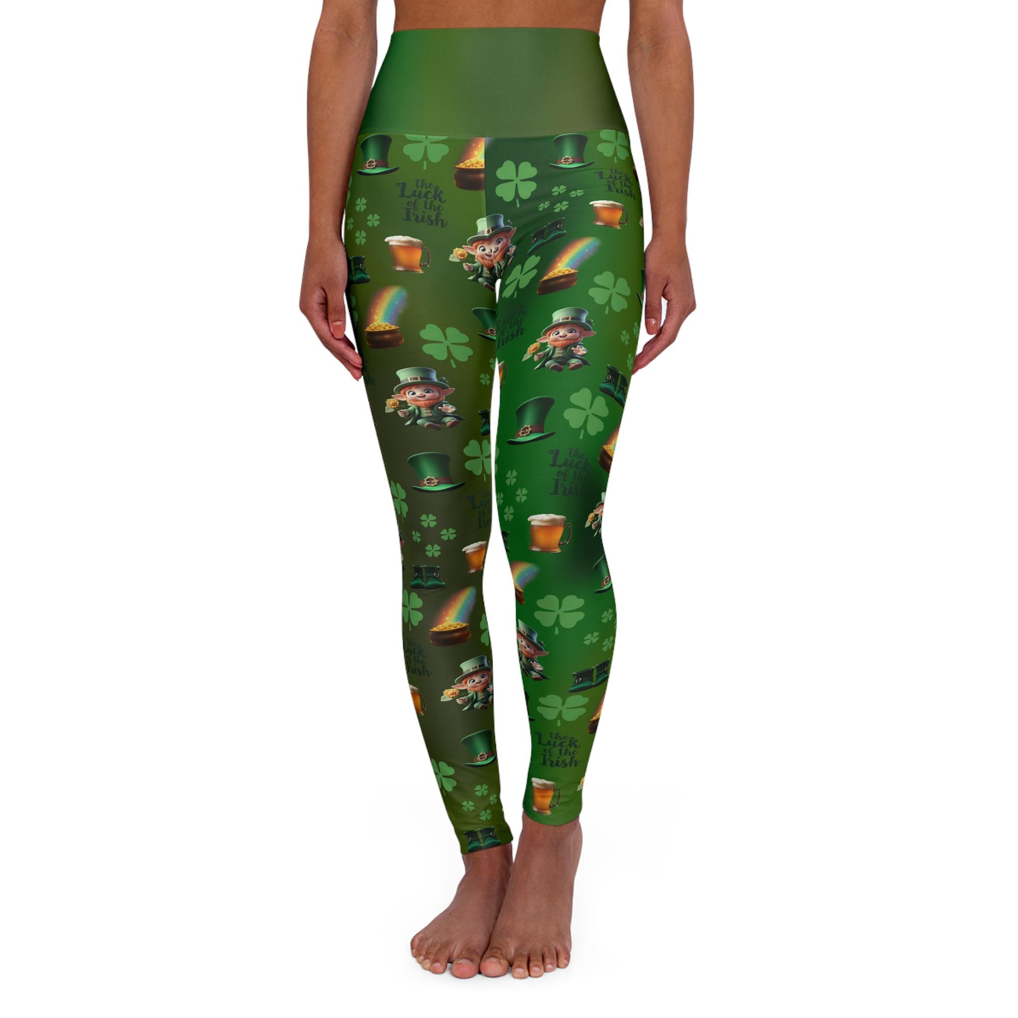 Slip into these high-rise leggings and carry a little mischief with you. A cheeky leprechaun and a glittering pot o’ gold peek out from a bright rainbow across a lively green field — fun, bold, and impossible to ignore. The double-layered waistband sits snug and steady at the waist so you can bend, stretch, and flow without fuss. The all-over print keeps the scene uninterrupted, wrapping you in color from hip to hem. Whether you’re rolling out your mat for a sunrise practice, layering for a festive run, or simply craving a playful pop in your everyday rotation, these leggings bring movement and personality together. They move with you thanks to four-way stretch, stay vivid wash after wash, and show off a slim, flattering silhouette that reads confident and spirited.