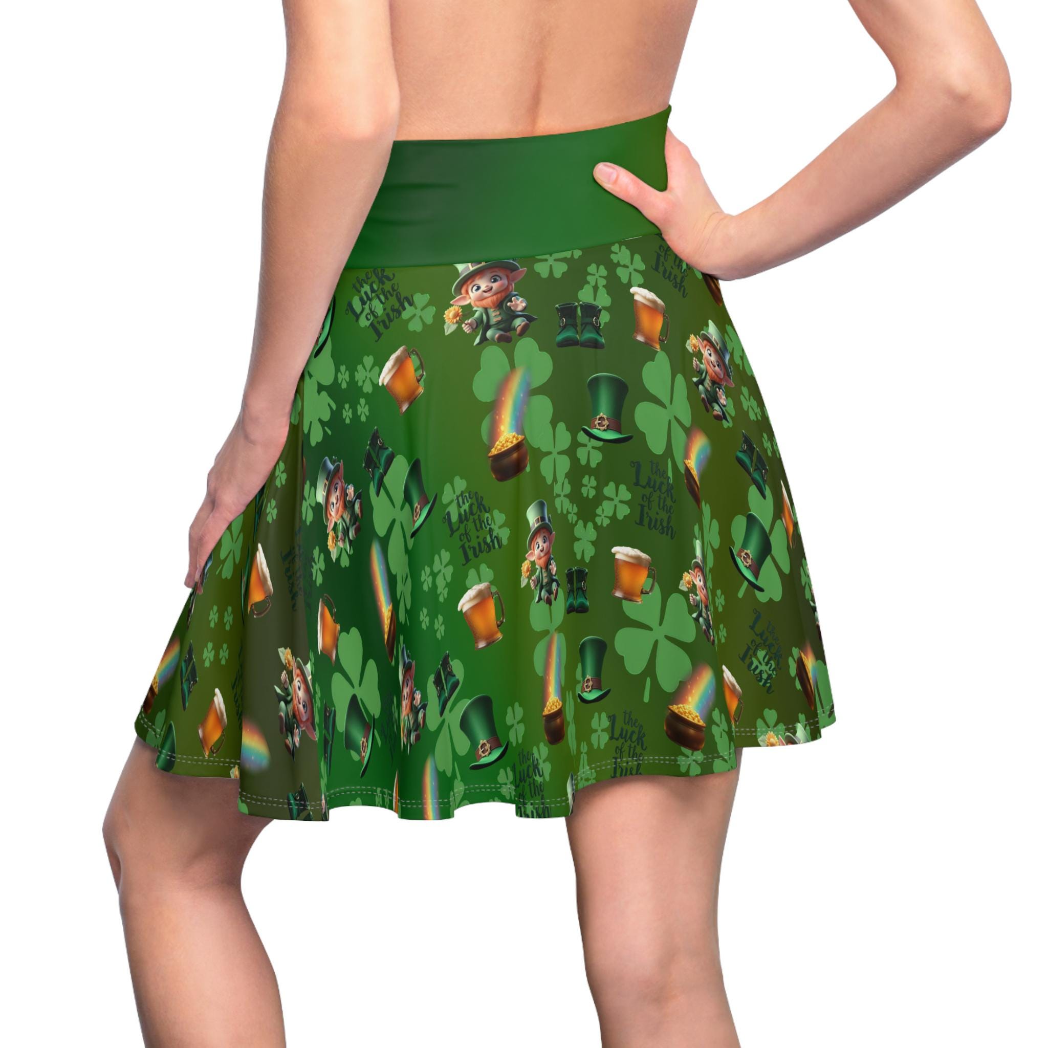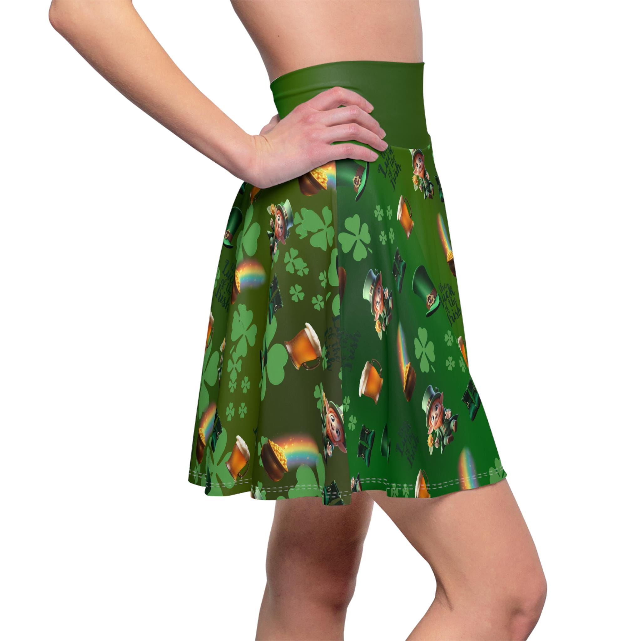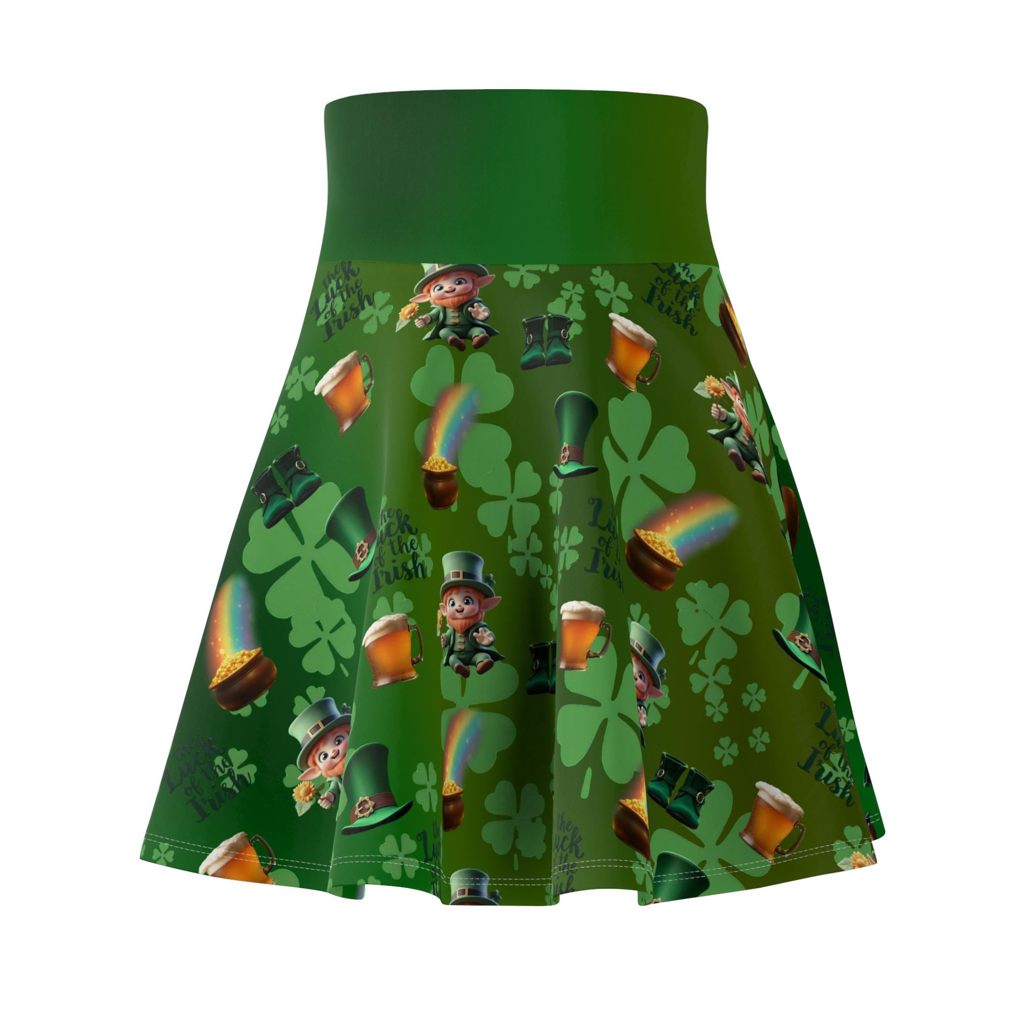 This skater skirt brings a playful burst of luck and color to everyday wear. Tiny leprechauns, scattered pots of gold, and arcing rainbows dance across a lively green field, creating a cheerful pattern that catches the eye. The high-rise double waistband gives a secure, flattering silhouette while the 4-way stretch lets you move freely—whether you're twirling down a festival lane, layering for a St. Patrick’s Day meetup, or adding whimsy to a casual weekend outfit. The flatlock seams lie smooth against the skin for comfortable all-day wear, and the vibrant all-over print keeps the fun front and center. Made with durable, stretch-forward fabric and thoughtfully assembled in the USA, this skirt feels as good as it looks—bright, confident, and ready for whatever small adventures the day brings.