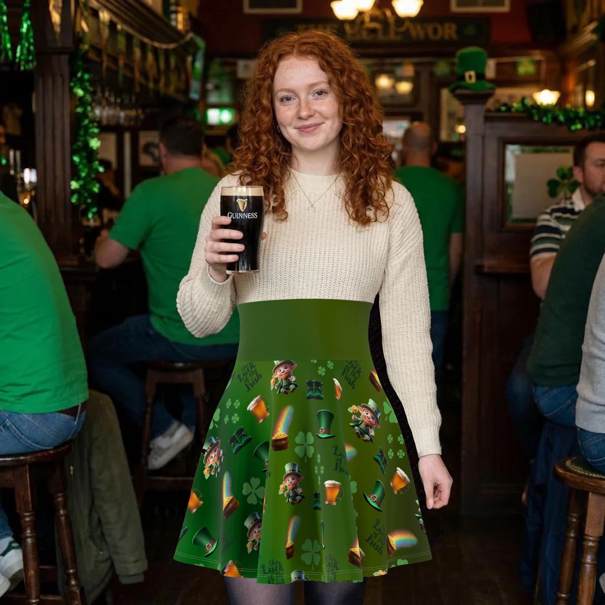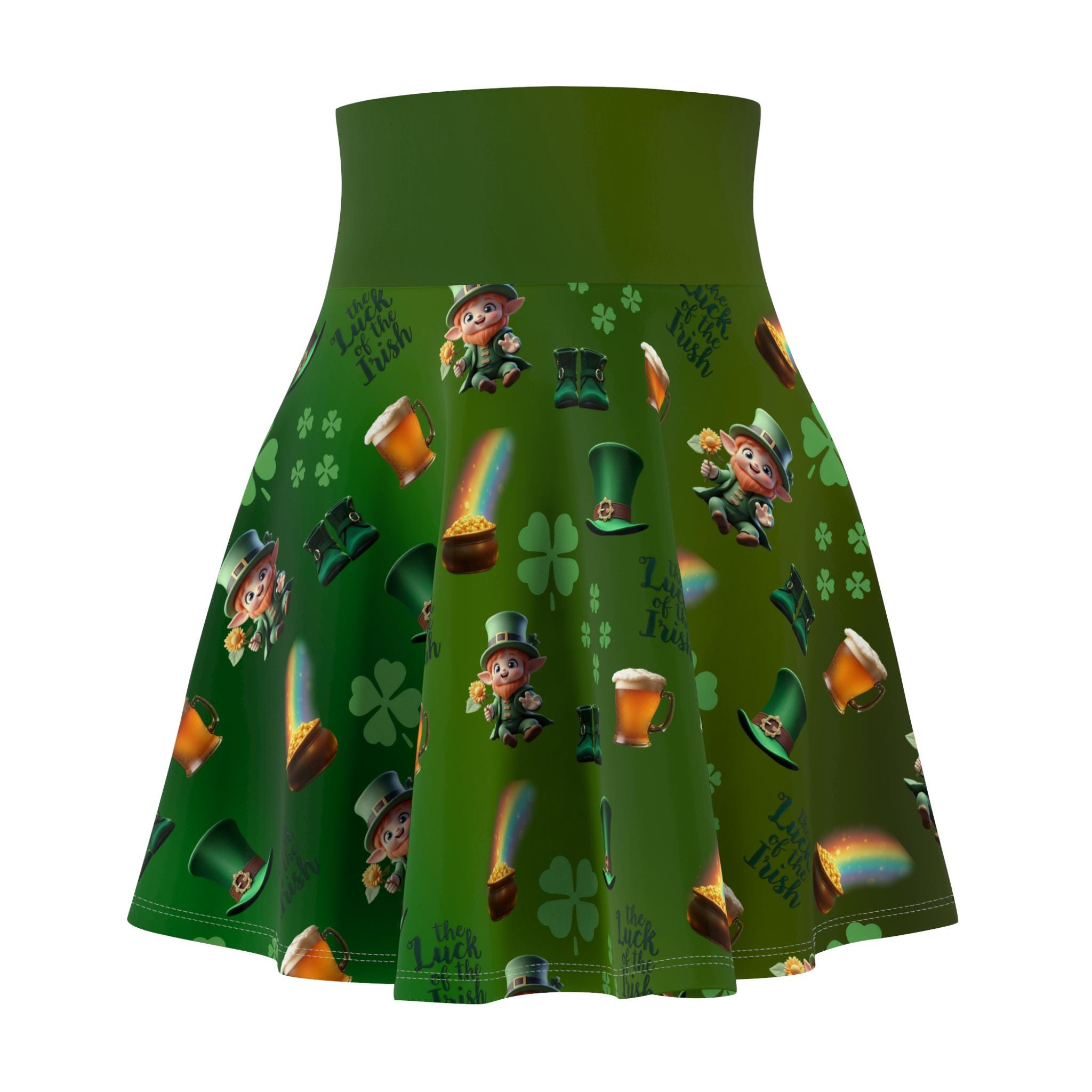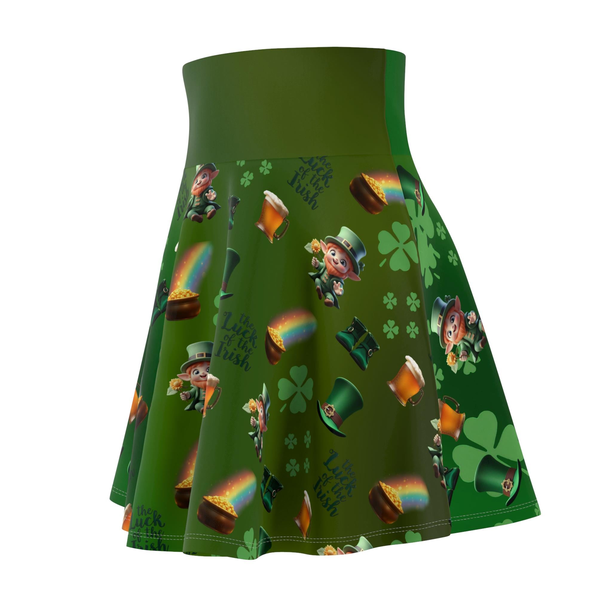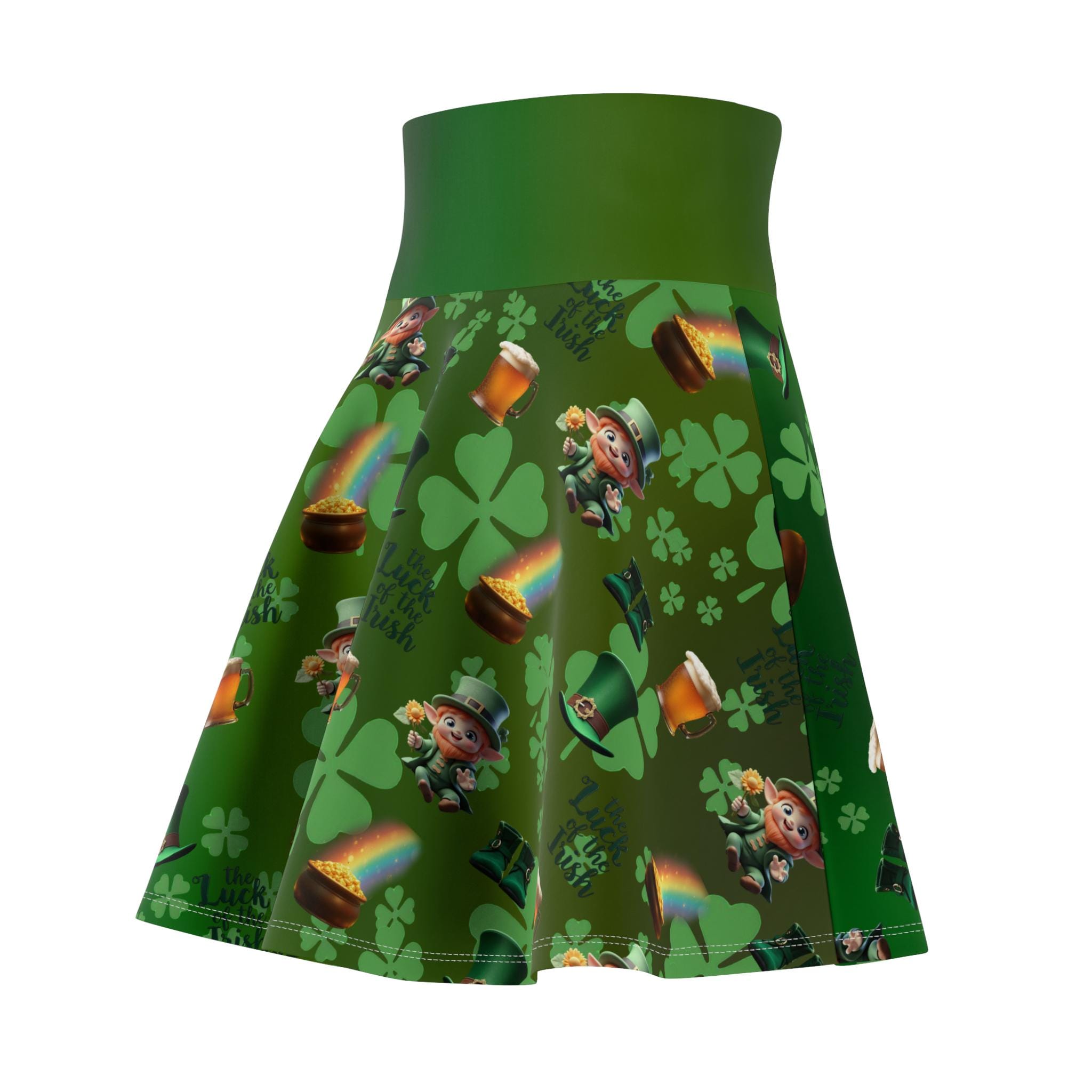 This skater skirt brings a playful burst of luck and color to everyday wear. Tiny leprechauns, scattered pots of gold, and arcing rainbows dance across a lively green field, creating a cheerful pattern that catches the eye. The high-rise double waistband gives a secure, flattering silhouette while the 4-way stretch lets you move freely—whether you're twirling down a festival lane, layering for a St. Patrick’s Day meetup, or adding whimsy to a casual weekend outfit. The flatlock seams lie smooth against the skin for comfortable all-day wear, and the vibrant all-over print keeps the fun front and center. Made with durable, stretch-forward fabric and thoughtfully assembled in the USA, this skirt feels as good as it looks—bright, confident, and ready for whatever small adventures the day brings.